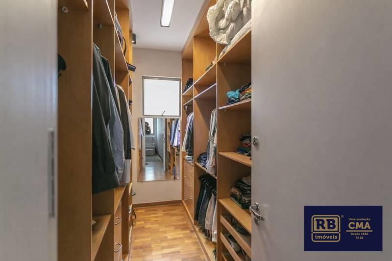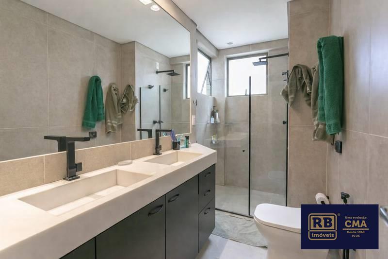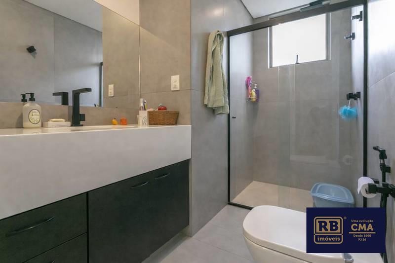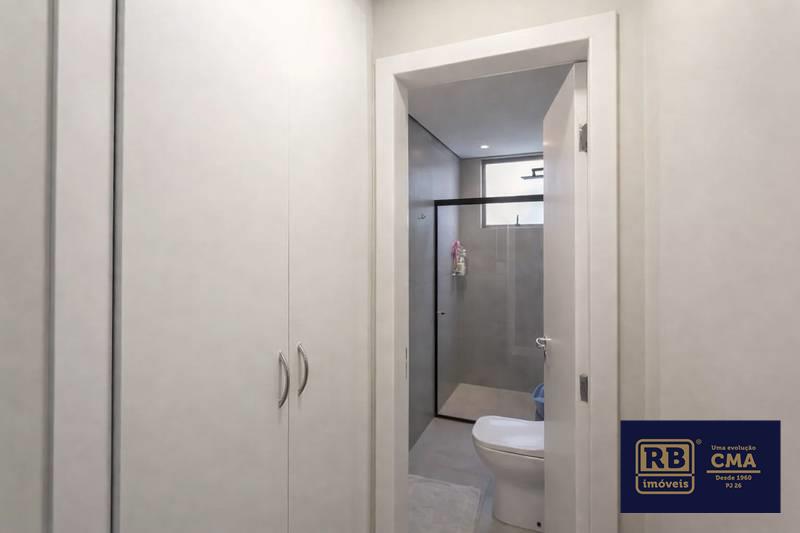 Banheiros (social e suíte) com box em blindex, armários e espelhos.