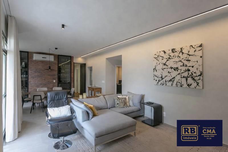 Sala para 02 ambientes, com piso em porcelanato, teto em gesso, projeto de iluminação da A de Arte, ar-condicionado, adega e varanda integrada.